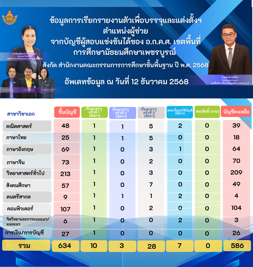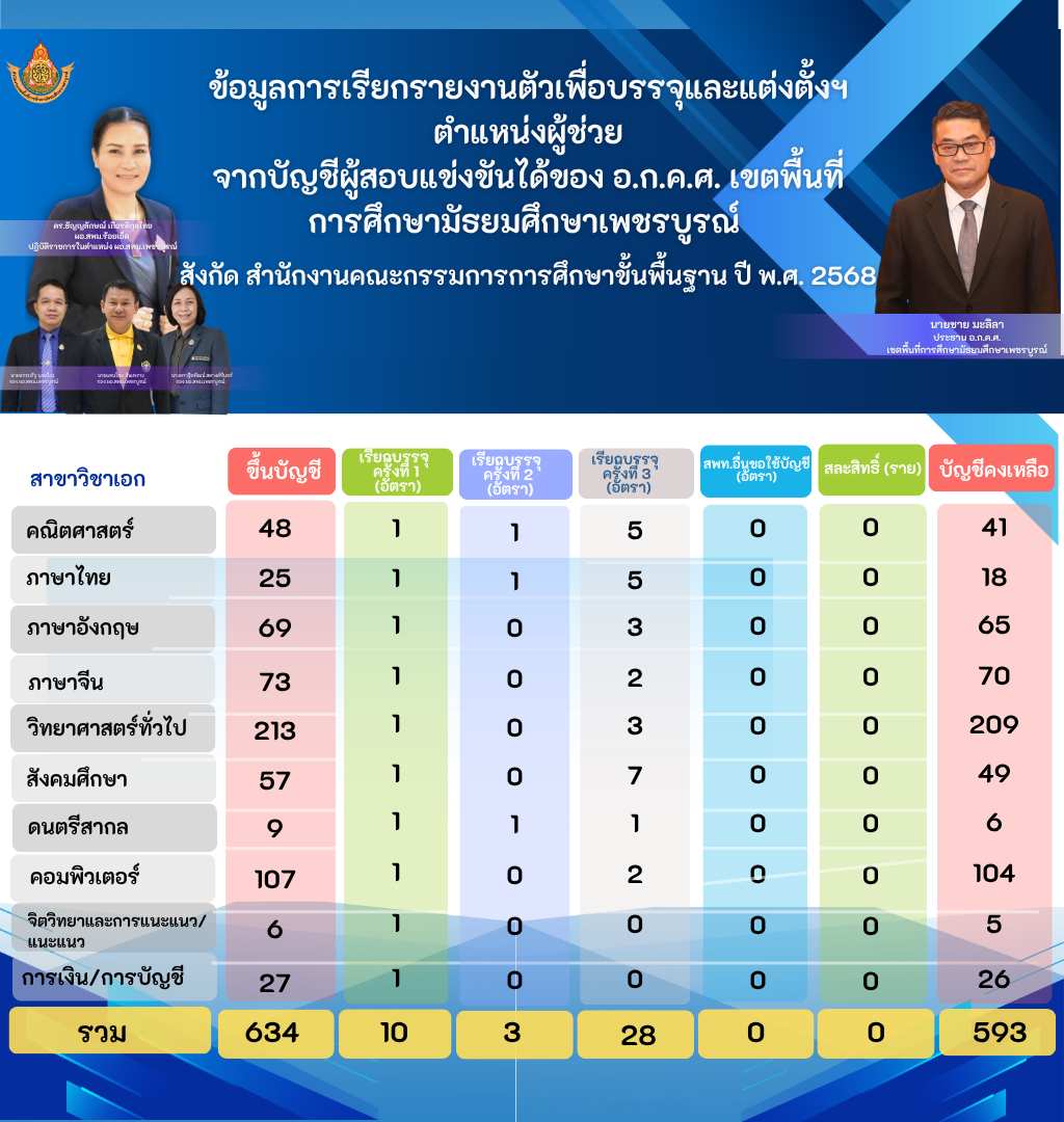 ข้อมูลสถานะบัญชีผู้สอบแข่งขั้นได้ ตำแหน่งครูผู้ช่วย ของ อ.ก.ค.ศ.เขตพื้นที่การศึกษามัธยมศึกษาเพชรบูรณ์ ปี พ.ศ. 2568
